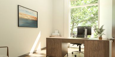 Private Office suites with large windows, available for rent, furnished with a desk, guest chair, personal printer & printer table.